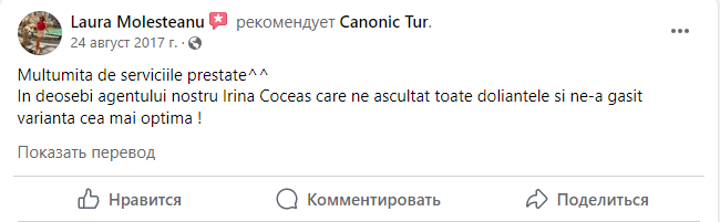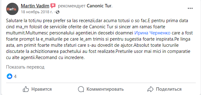 Informatiile de pe https://canonic-tur.com/ sunt publicate in limba româna, rusa si engleza. Noi nu garantam ca informatia de pe pagina noastra web (incluzand, dar fara limitare, tarifele, descrierile sau datele) nu poate avea erori sau lipsuri, dar vom depune tot efortul sa corectam erorile de indata ce ne sunt aduse la cunostinta la urmatoarele date de contact: info@canonic-tur.com, tel. +373022272728